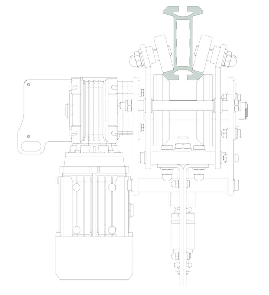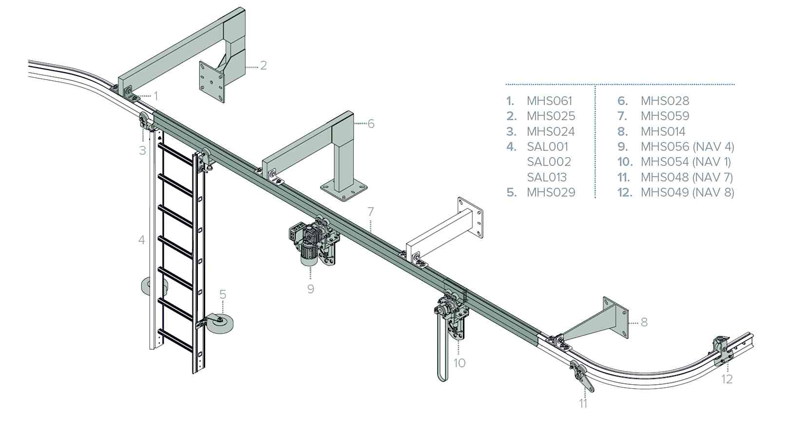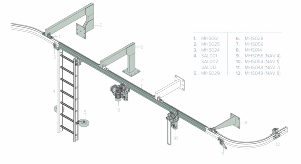 5m ile 300m arası yüksekliklerdeki yapılarda askıda erişim için uygundur. Kıvrılabilen ray toz kaplamalı ve istenilen renge boyanabilir. Şaryolar rayın üstündeki kenarlardan döner. Elle çalışan, motorlu veya şarj edilir üniteli şaryolar yatay hareketler için kullanılır.