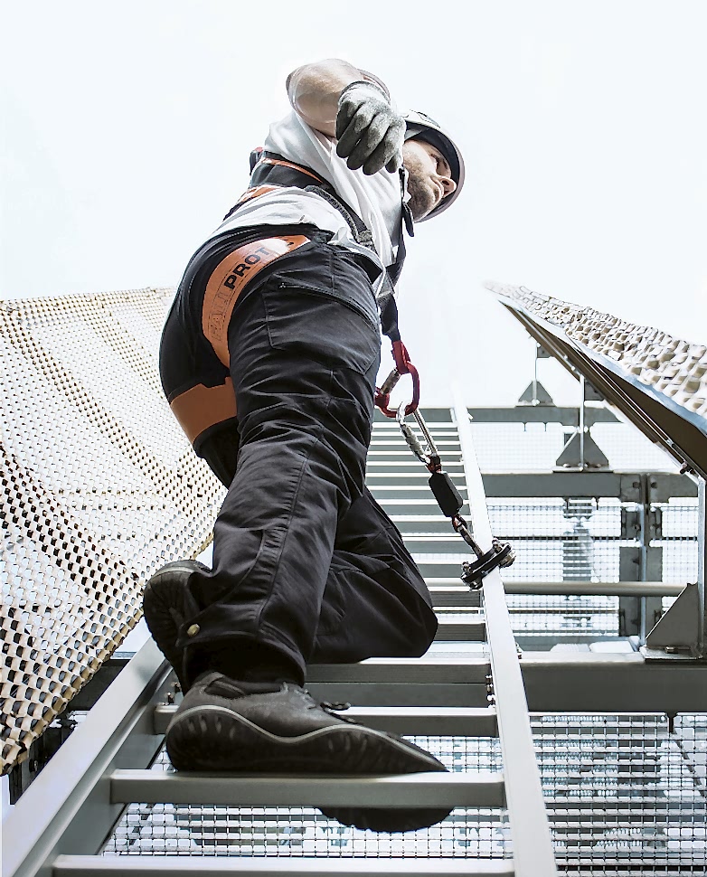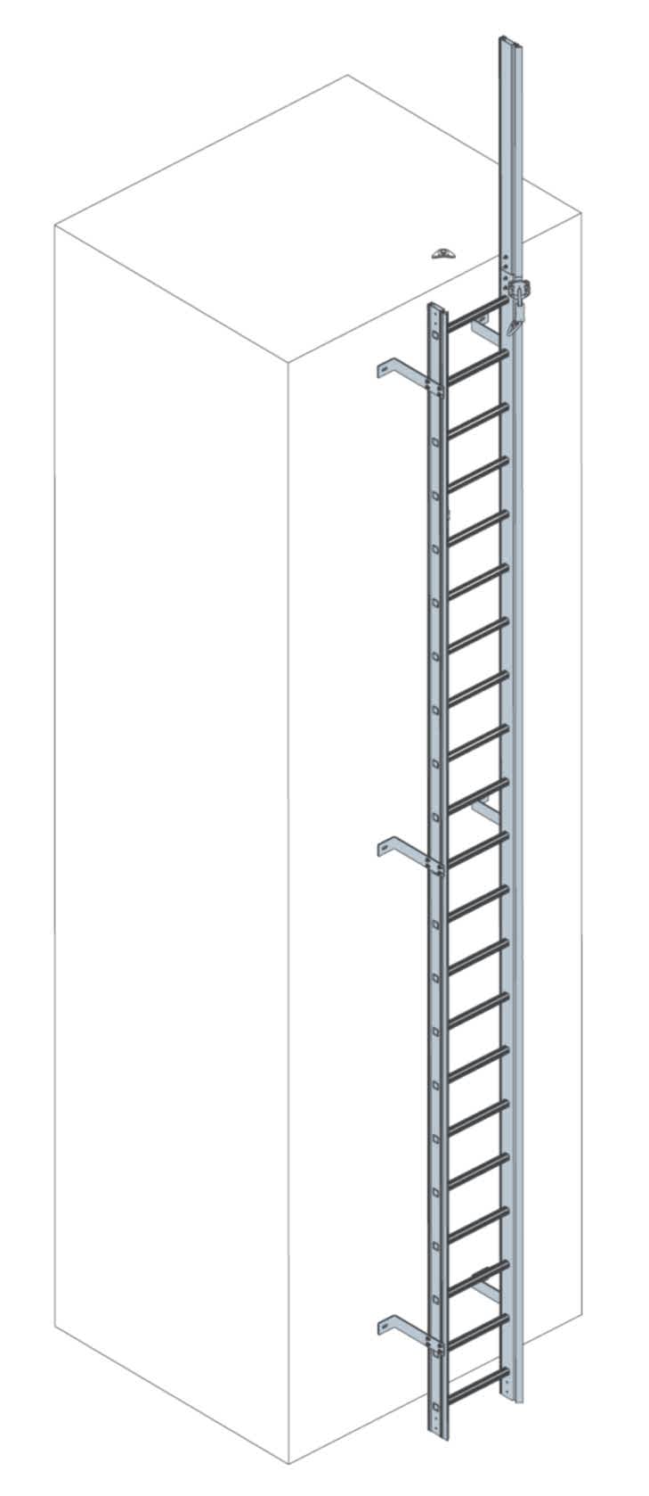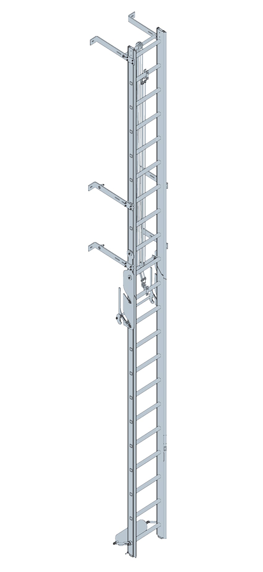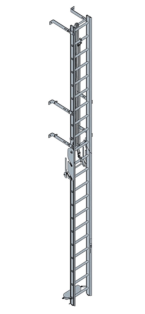 Kullanıcı, tam donanımlı bir emniyet kemeri ile dikey merdivene entegre olan düşme önleyici raya doğrudan bağlıdır.