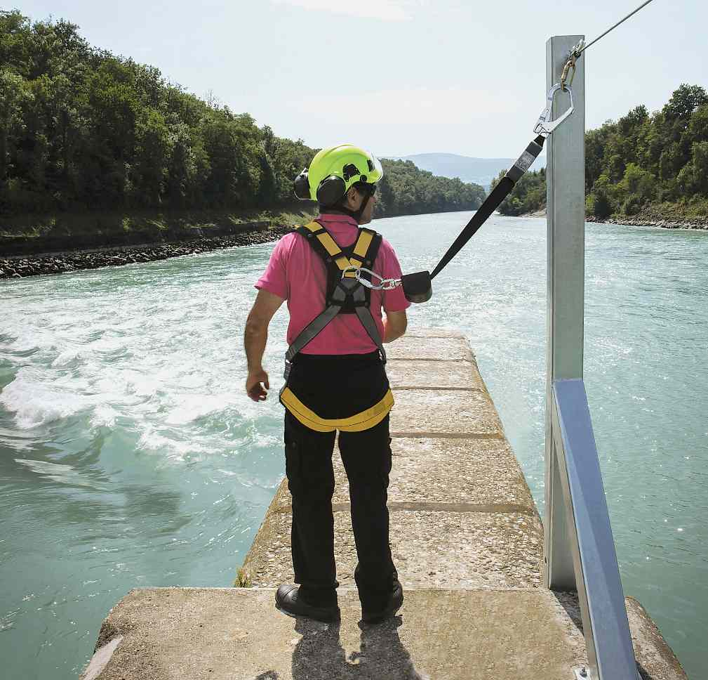 En çok sanayii hollerinde kullanılan sistem, yasam hattı kullanıcısının basının üzerindeki bir yüksekliğe montajlanır, düşme mesafesini azaltır.