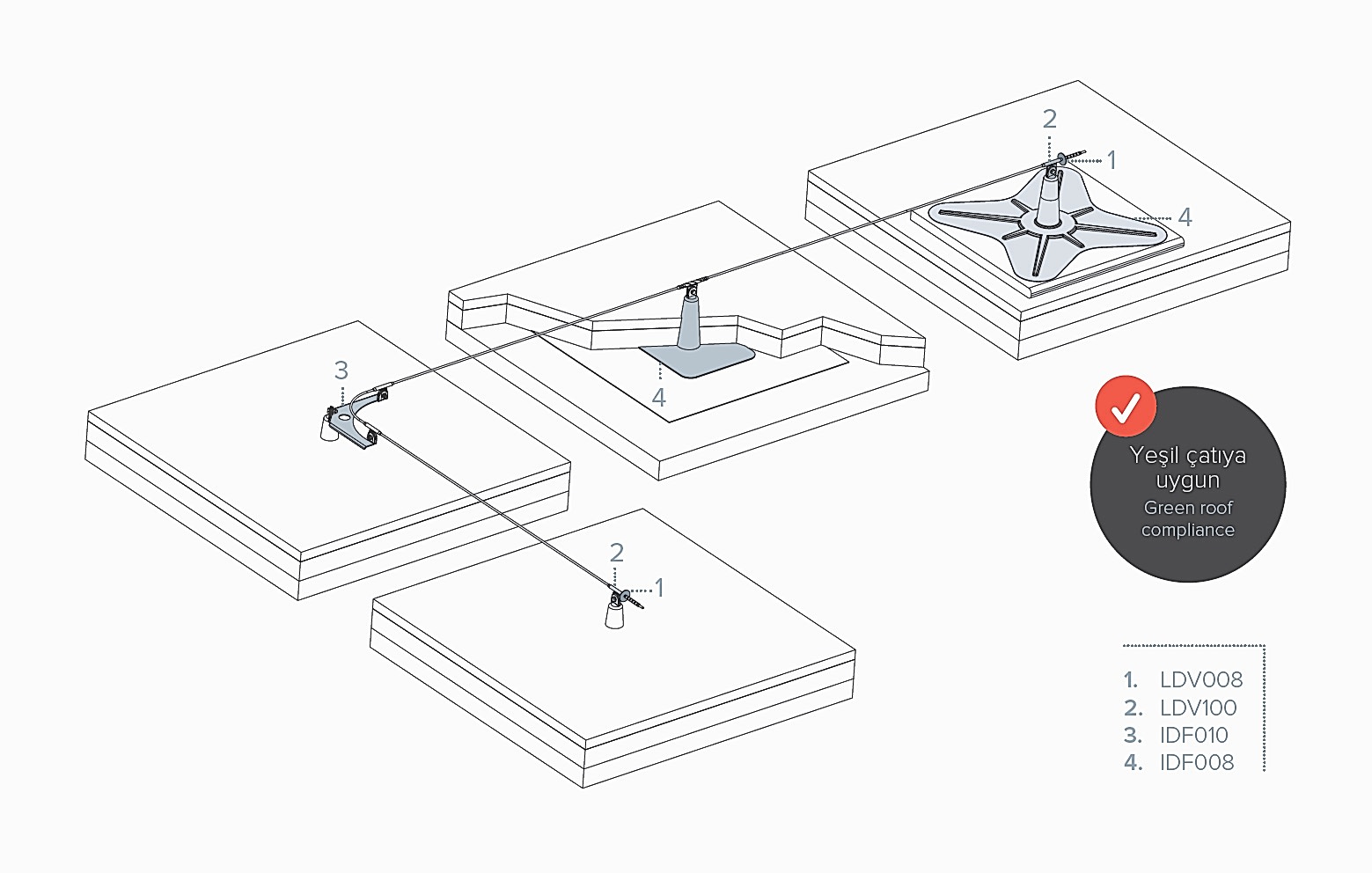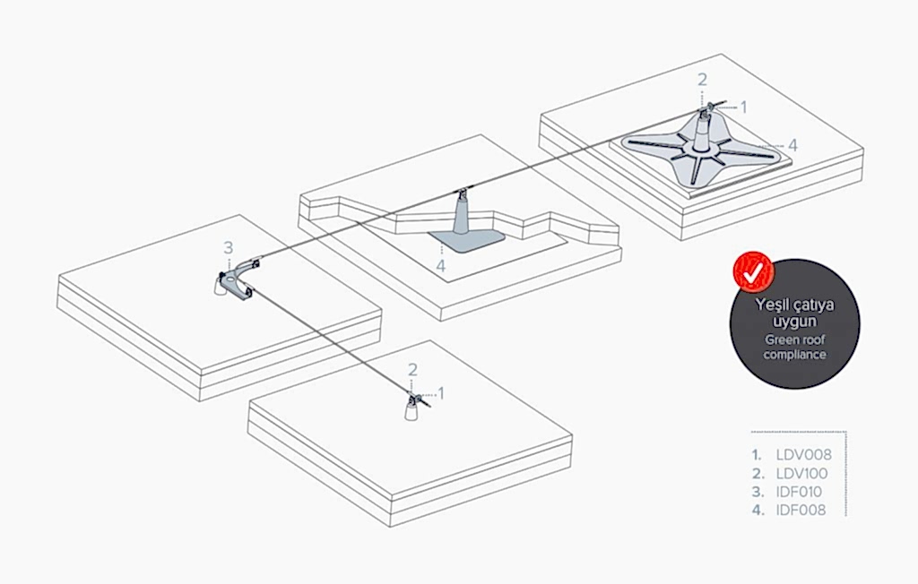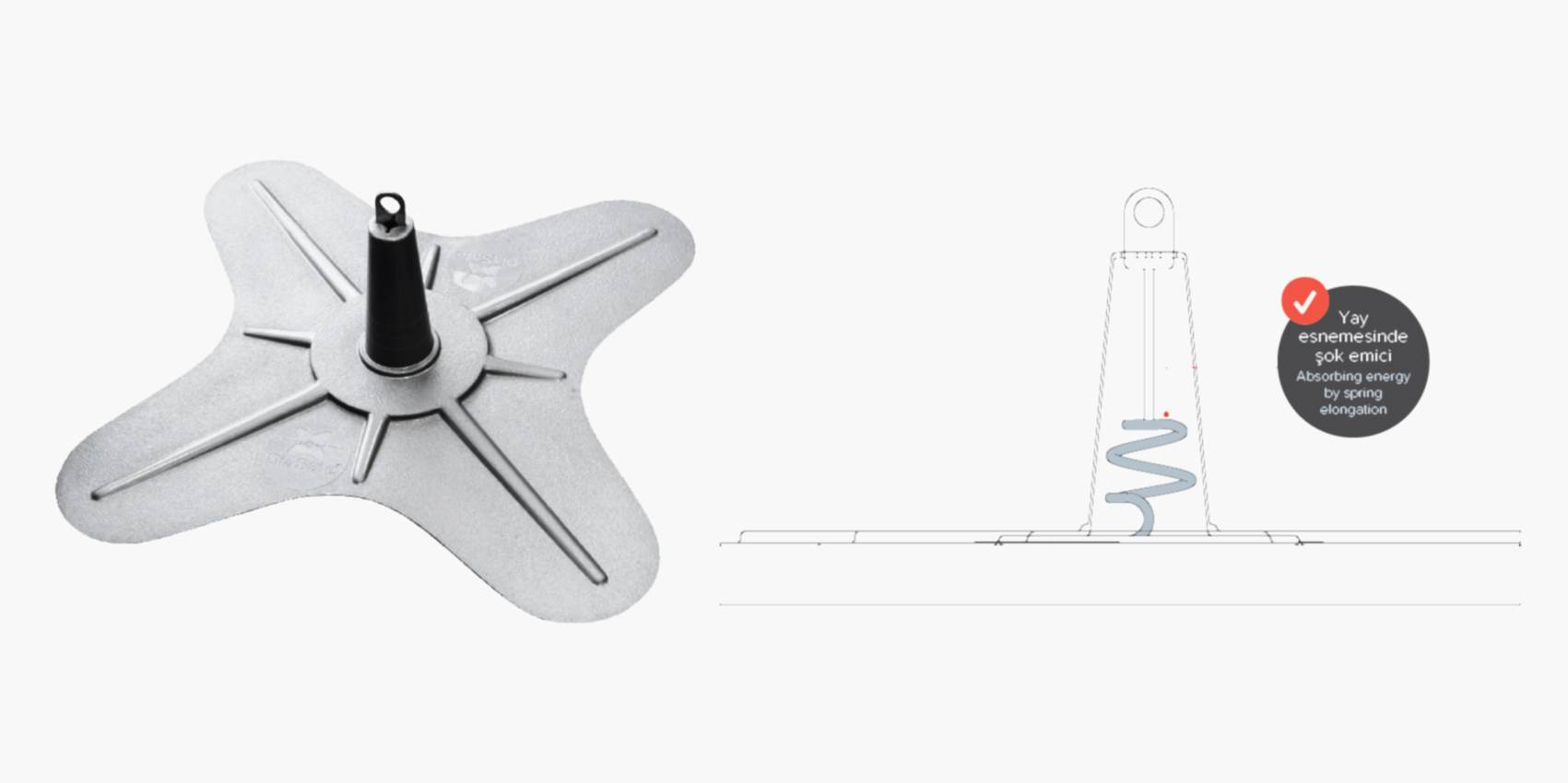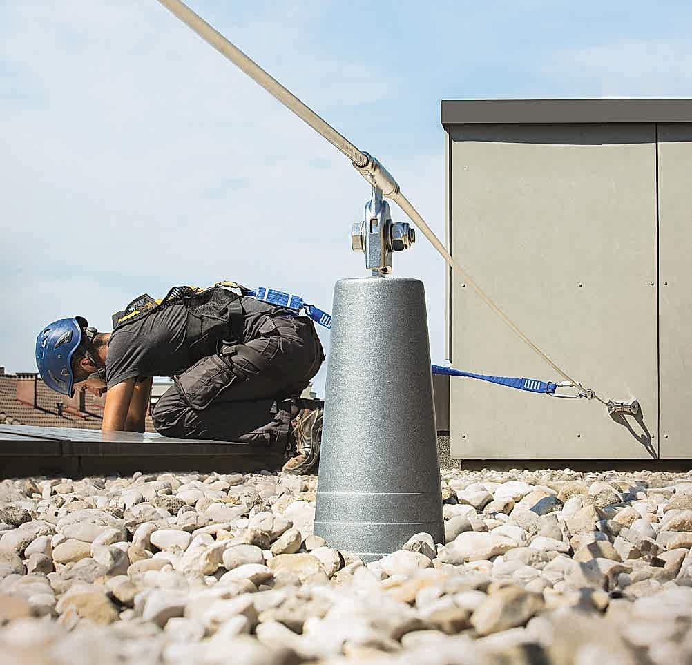 Sisteme bir şok emici dahil edilmiştir. Dengesi çakıl veya ekstra bir alt tabaka ağırlıkla sağlanır. Montajlama, çatı membranına nüfus etmeden sağlanır. Termik köprüler ve su sızdırma riski ortadan kaldırılır. Düşme durumunda direkt deforme olur ve alt katmanları korunur.
